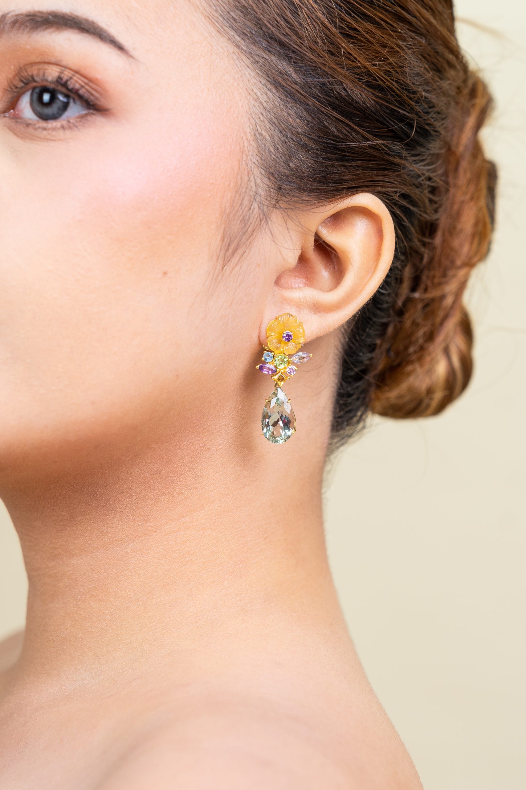 These 14k gold earring feature hand-carved yellow quartz flowers surrounded by dance of amethyst, peridot, pink sapphire, and aquamarine. Finished with 11.50 carats of detachable green amethyst drops for look that transitions seamlessly from sun-drenched garden to elegant evening.