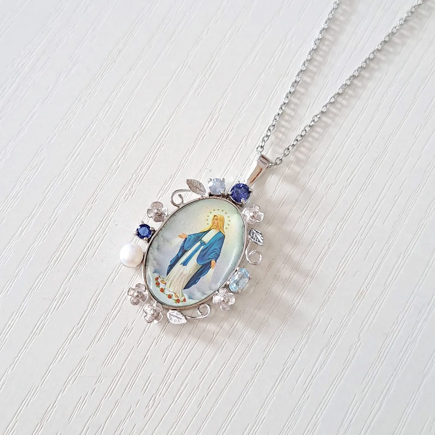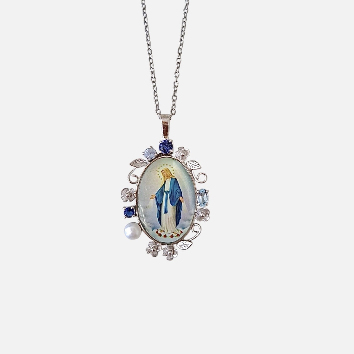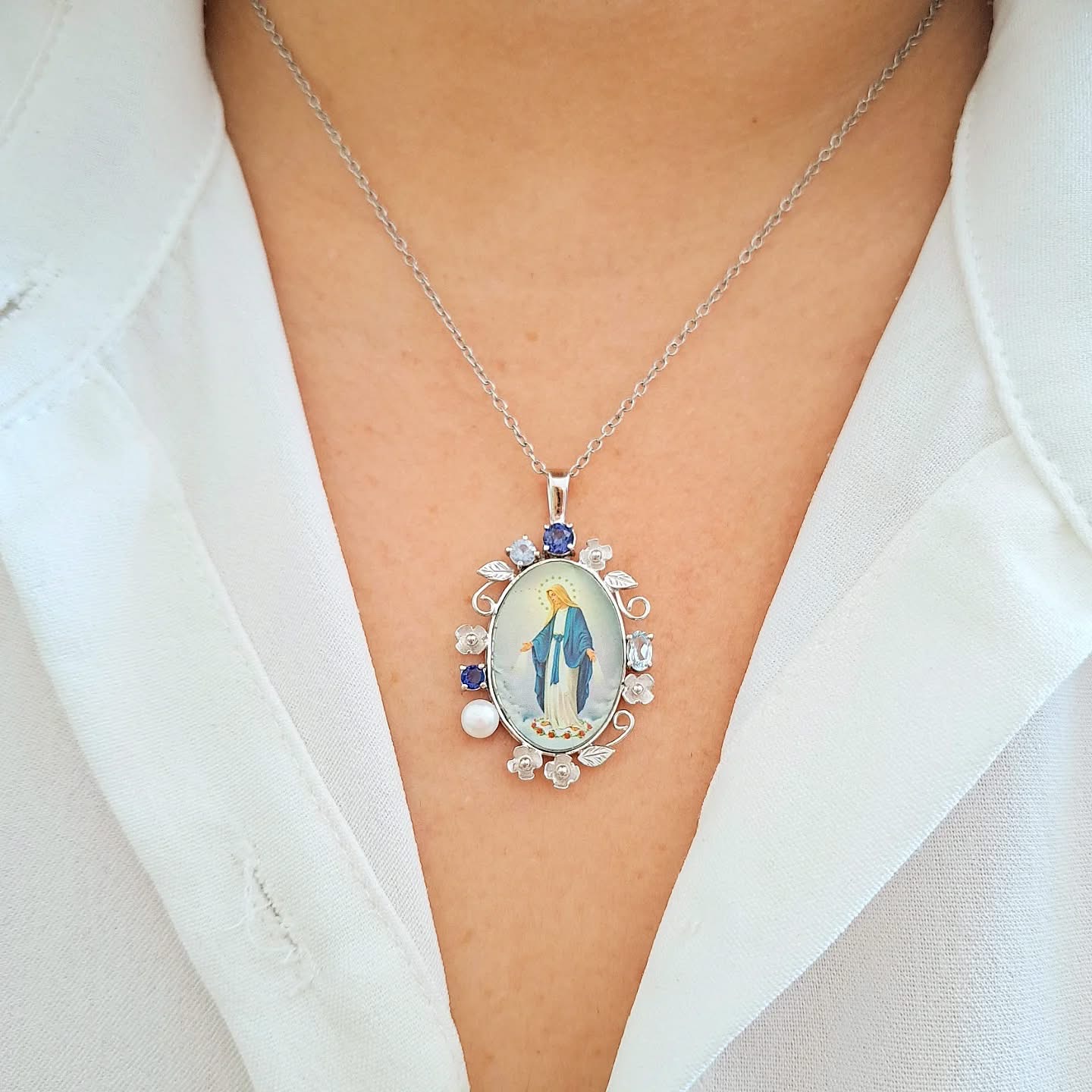 Heavenly blues meet classic devotion. Featuring genuine blue sapphire, aquamarine, and freshwater pearl accents, this 14k Lady Miraculous pendant is a beautiful daily reminder of faith.