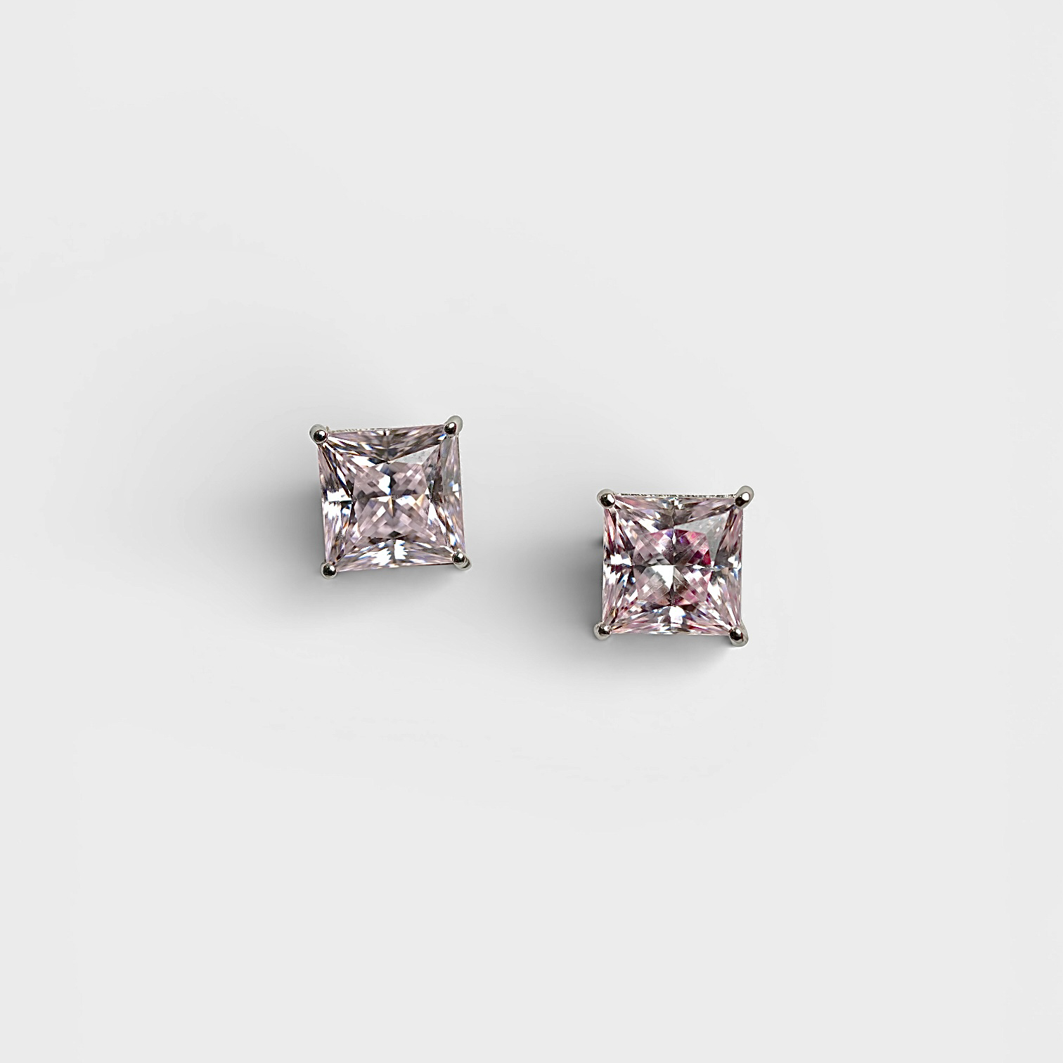 14 carat pink moissanite princess cut stud earrings set in 14k white gold.